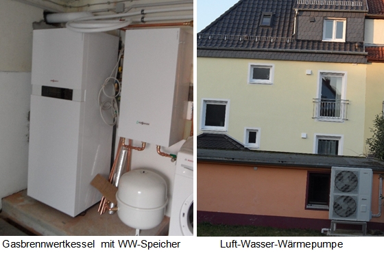 • Umstellung der Wärmeversorgung von Heizöl auf Erneuerbare Energien mit Gas-Brennwerttechnik und einer Luft-Wasser-Wärmepumpe zu einer Hybridanlage für die Raumwärme und das Brauch-Warm-Wasser. Einbau neuer, dem Wärmebedarf angepaßter Heizkörper mit Thermostatventilen.